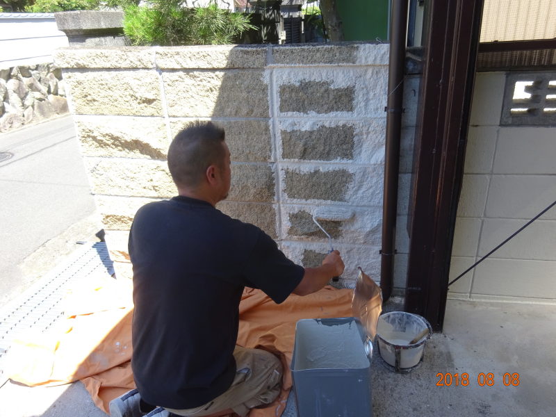 東側境界ブロックです。大谷石なのでムラができないように注意します。