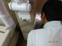 特別養護老人ホーム A様施設 トイレ手摺取付 取り外した後に壁からボルトが! 付け替える手摺を一旦外します。 木箱にボルトを差し込んでいきます。 固定ボルトを差し込むために孔を開けます。 床を固定します。 手すりをボルトで固定します。 ボルトで固定しました。 箱に蓋をします。 備前市老人ホーム様